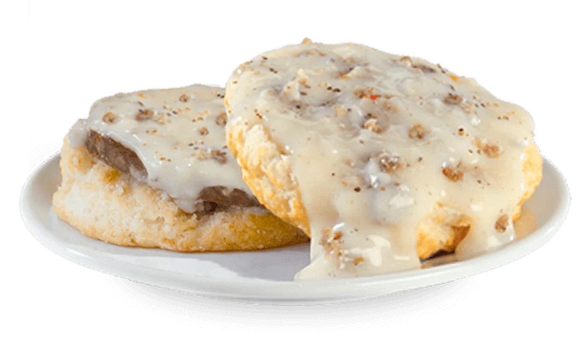 Hot, open-faced, made-from-scratch buttermilk biscuit topped with delicious, country style sausage gravy.