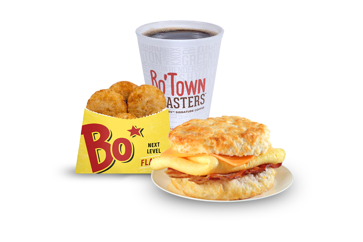 Eggs, hickory smoked bacon and American cheese on a made-from-scratch buttermilk biscuit, served with Bo-Tato Rounds®, coffee or medium drink.