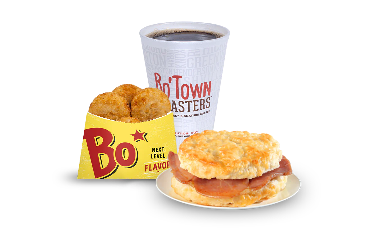 Country ham on a made-from-scratch buttermilk biscuit, served with Bo-Tato Rounds®, coffee or medium drink.