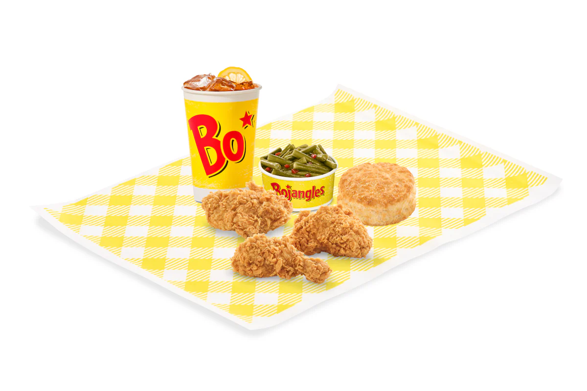 4 pieces of boldly seasoned chicken, 8 chicken breast tenders marinated with a bold blend of seasonings, plus 4 made-from-scratch biscuits, 2 fixin’s, and a 1/2 gal. of tea.
