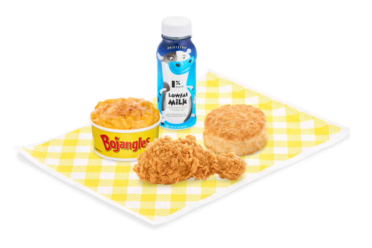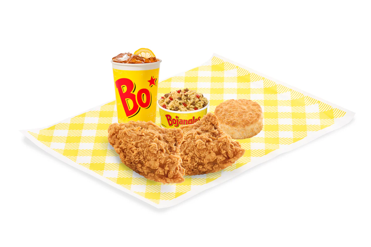 2 chicken breast tenders made with bold flavor and served with a made-from-scratch biscuit, a fixin’, and a milk.