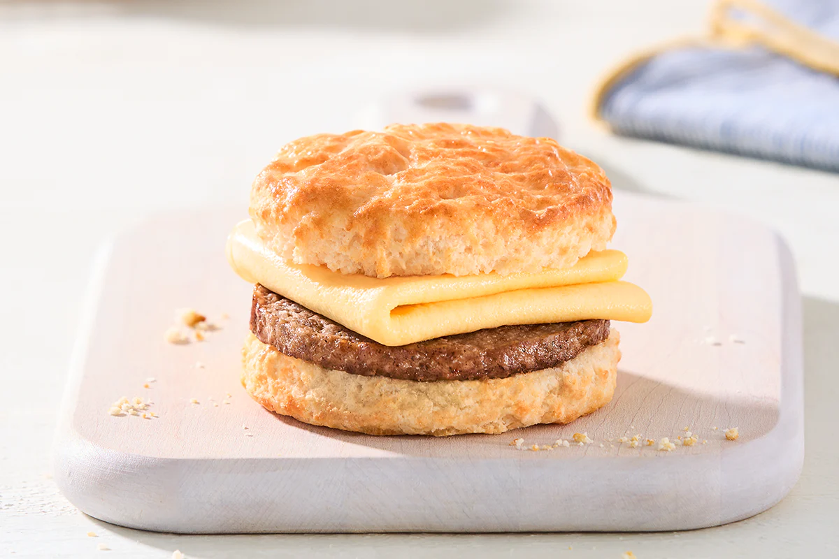 Eggs, country style sausage and American cheese on a made-from-scratch buttermilk biscuit.