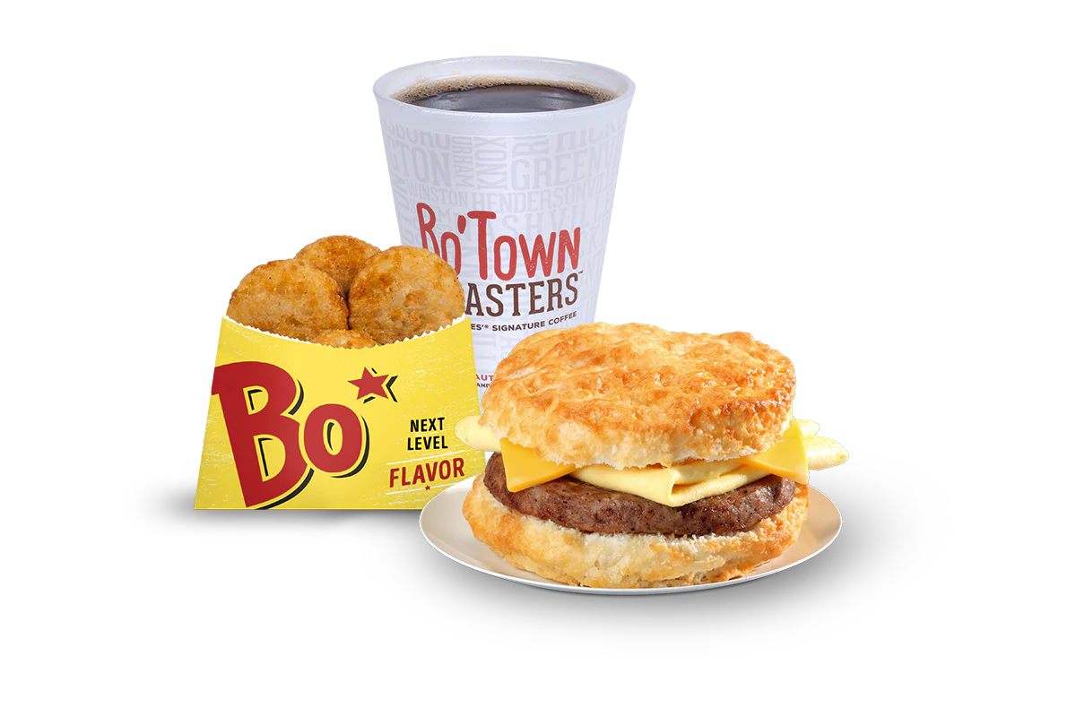 The perfect blend of sweet and savory, the Bo-Berry® Sausage Biscuit brings together country-style sausage and made-from-scratch buttermilk biscuits stuffed with sweet Bo-Berries®, all topped with a touch of sweet icing. Served with Bo-Tato Rounds®, coffee or medium drink.