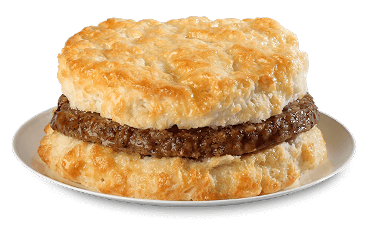 Country style sausage on a made-from-scratch buttermilk biscuit, served with Bo-Tato Rounds®, coffee or medium drink.