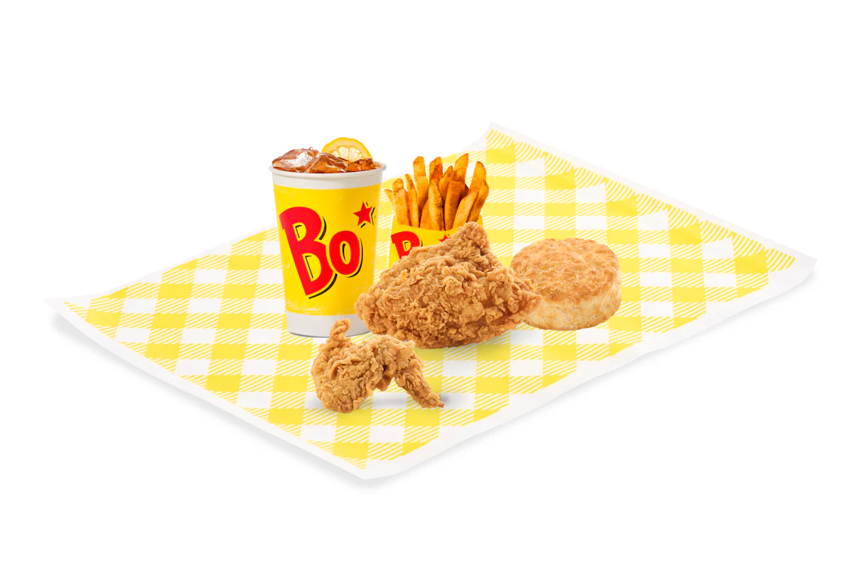1 boldly seasoned breast, 1 boldly seasoned wing, served with 1 home-style fixin’, a made from scratch buttermilk biscuit, and your choice of beverage.