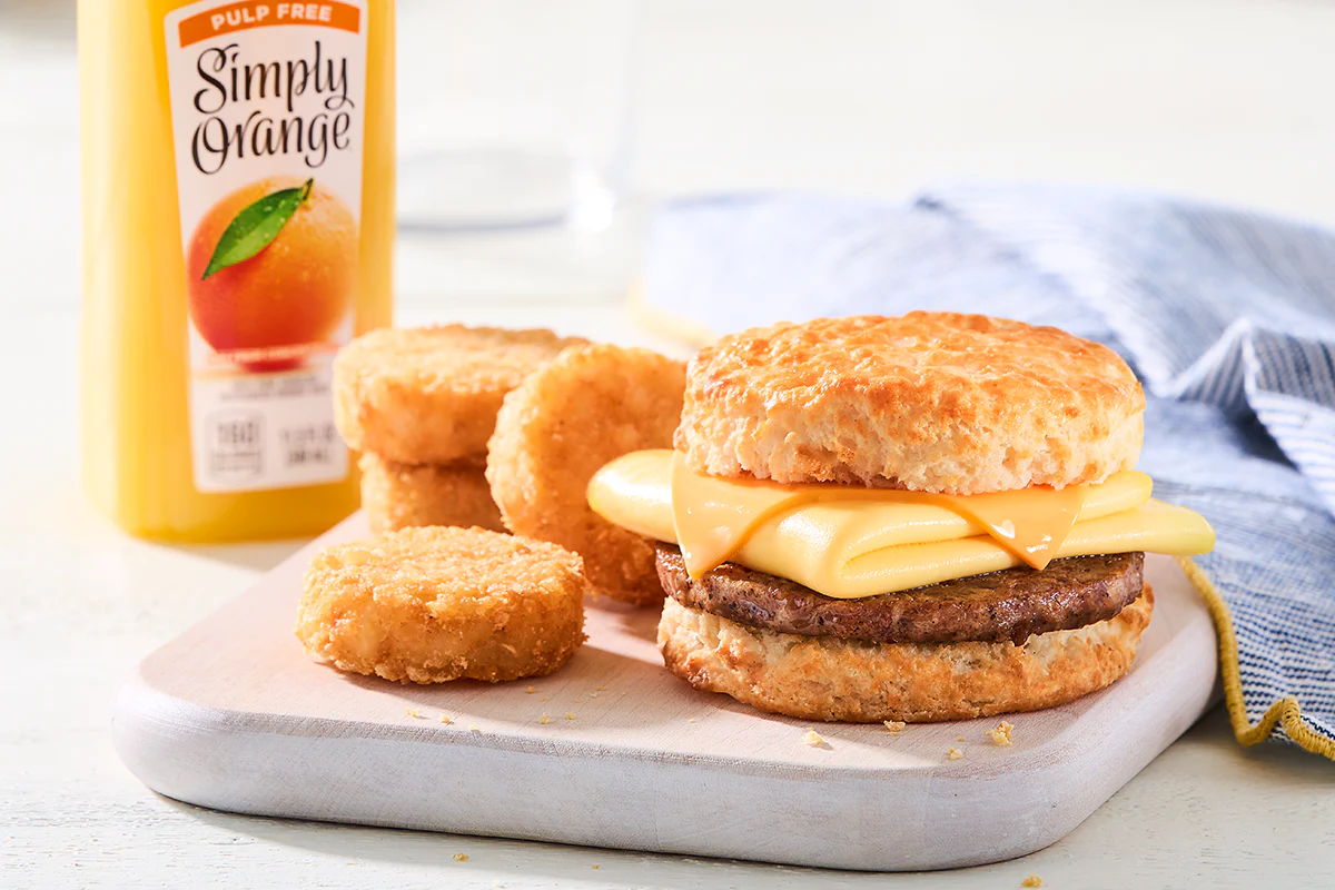 Eggs, country style sausage and American cheese on a made-from-scratch buttermilk biscuit, served with Bo-Tato Rounds®, coffee or medium drink.