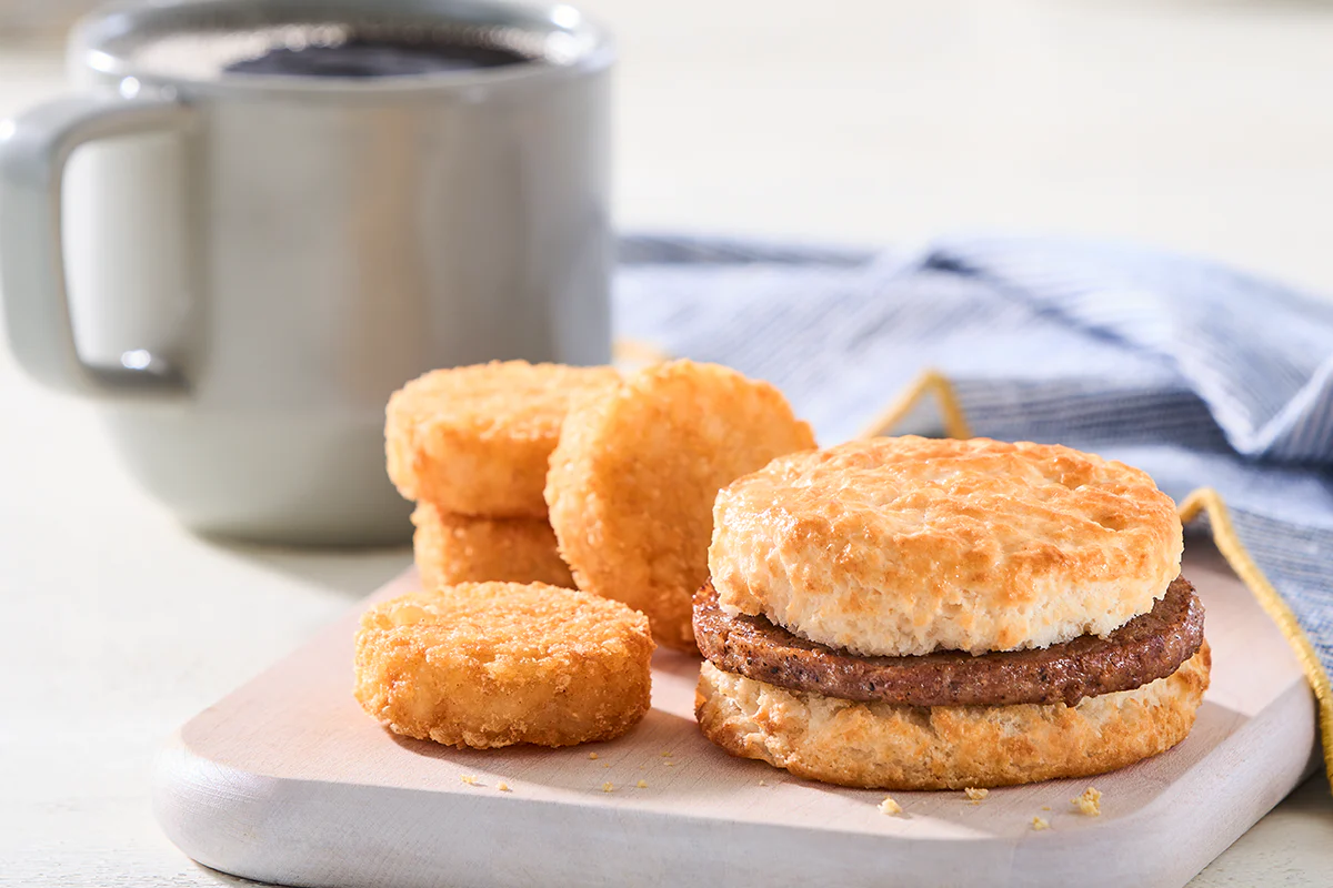 Eggs and country style sausage on a made-from-scratch buttermilk biscuit, served with Bo-Tato Rounds®, coffee or medium drink.