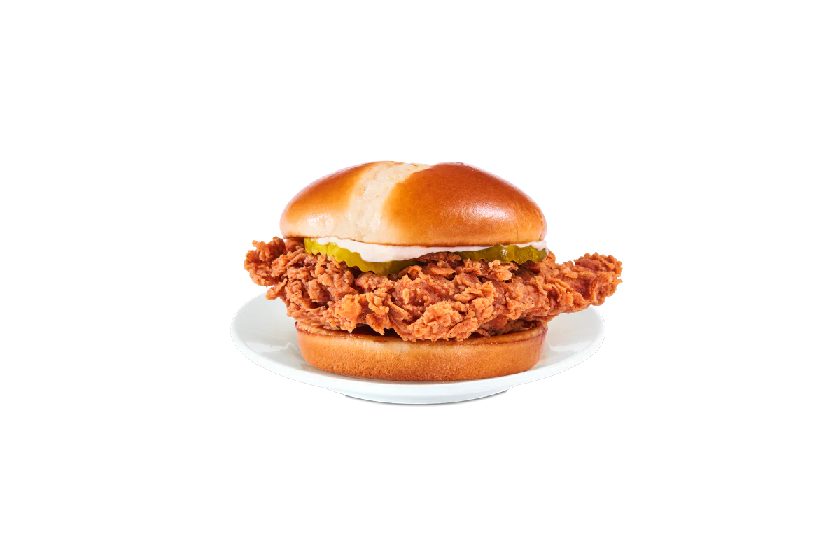 A juicy chicken breast, marinated in a secret blend of bold spices and hand-breaded with a crispy, crunchy buttermilk coating, topped with two thick cut dill pickles and creamy mayo, served on a toasted, buttered bakery bun.