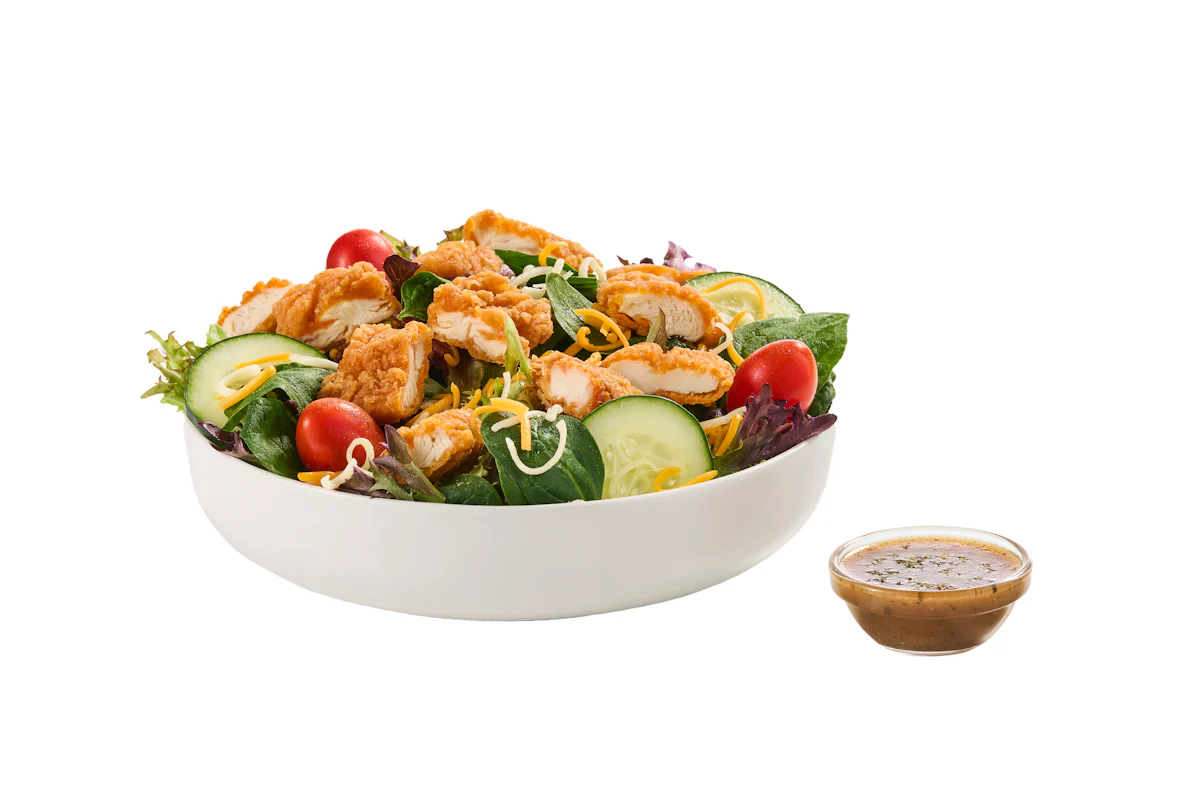 3 Chicken breast tenderloins marinated with a bold blend of seasonings served on a bed of fresh green leaf lettuce, red leaf lettuce, and baby spinach topped with cucumber slices, grape tomatoes, and Monterey Cheddar Cheese.
